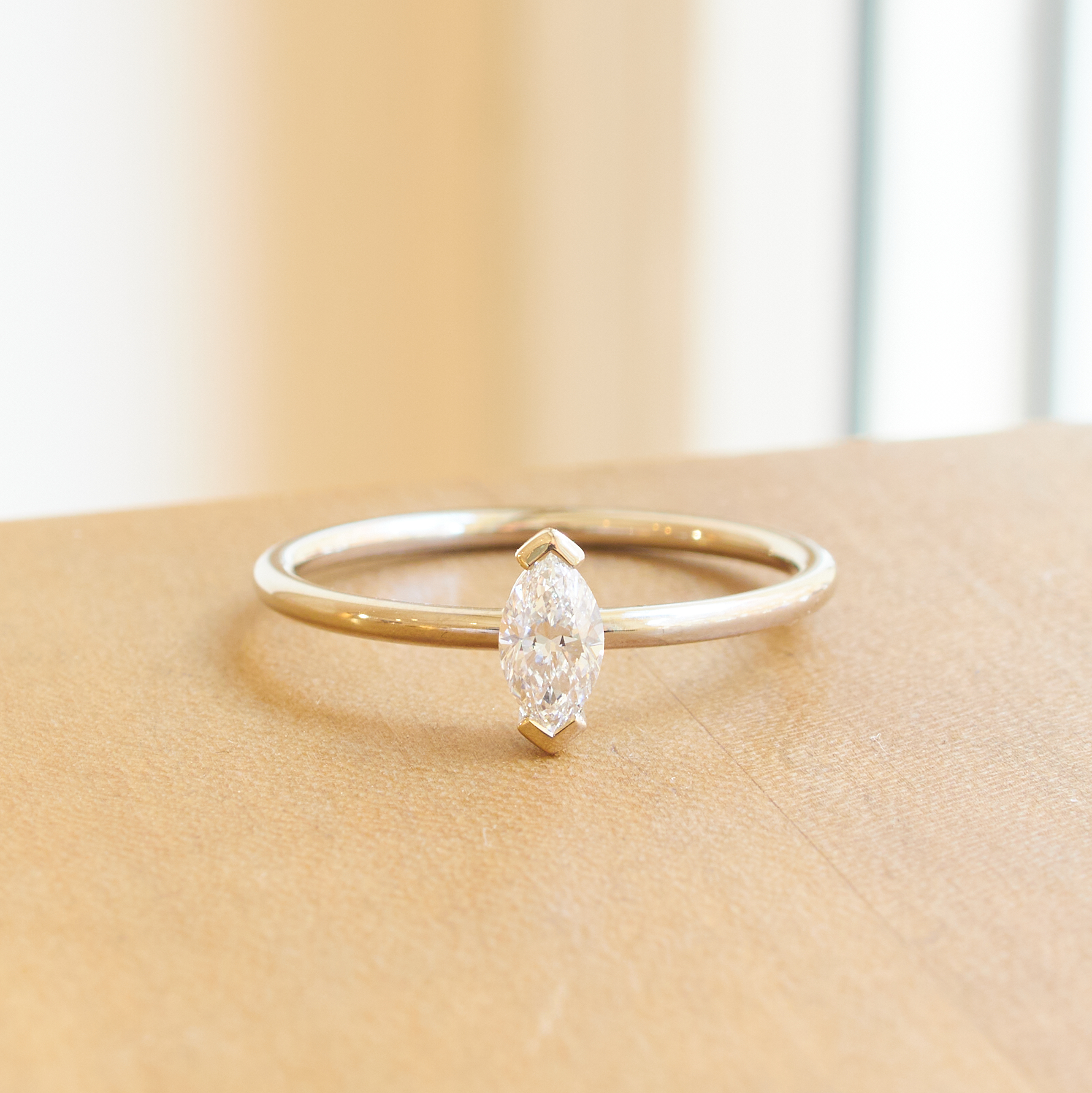 Dieser interessante Diamant im Marquise-Schliff klemmt zwischen den zwei Enden einer Fassung aus 585 Weißgold – besonders fein.